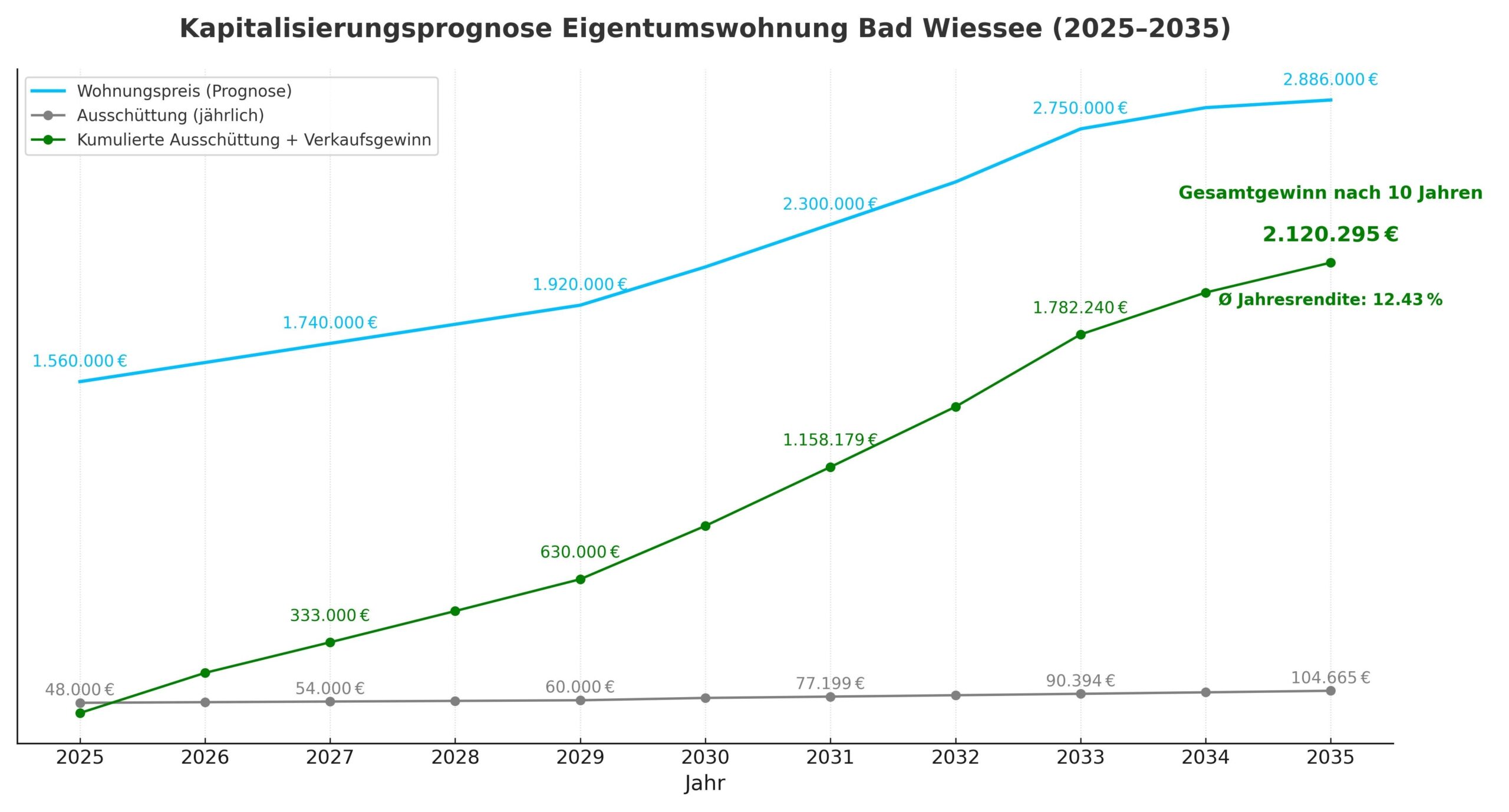Wertentwicklung mit deutlichem Potenzial. Unsere Prognose für die nächsten zehn Jahre ist bewusst konservativ angesetzt – mit einer angenommenen Preissteigerung von 80 %. Doch der Blick in die Realität zeigt: Im Luxusimmobilien-Segment lag die tatsächliche Wertentwicklung in den vergangenen zehn Jahren bei über 120 %.
