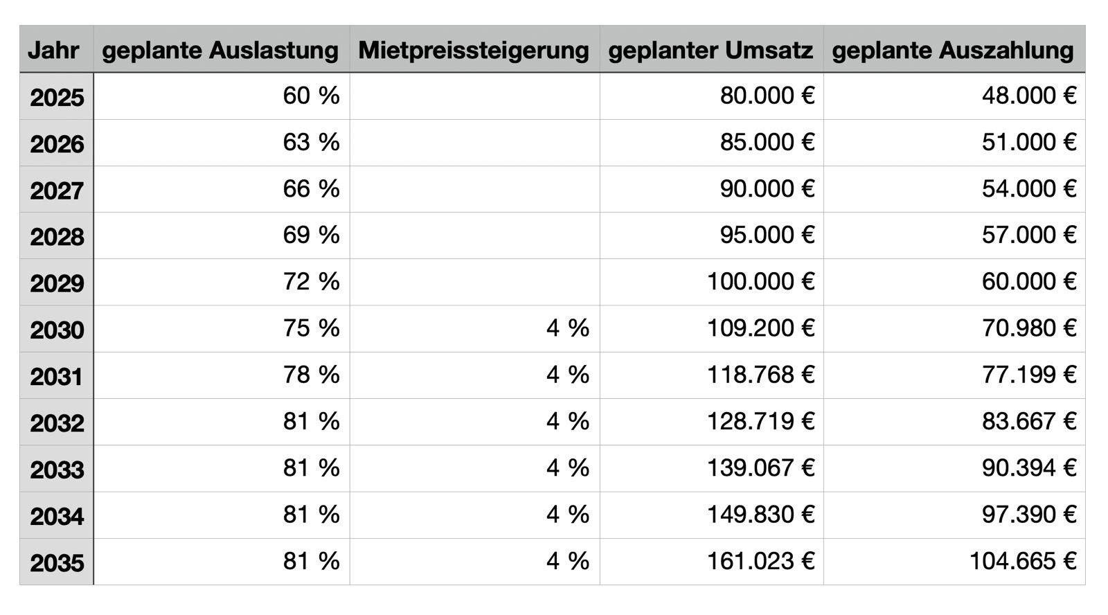 Unsere Erfahrung und unser exklusiver Full-Service ermöglichen jährliche Mieteinnahmen von über 100.000 €. Unser bisheriger Spitzenwert liegt sogar bei 114.000 € – ein klares Zeichen für das außergewöhnliche Potenzial dieser Immobilie. Die Plan-Zahlen für die nächsten 10 Jahre betragen je Wohnung: